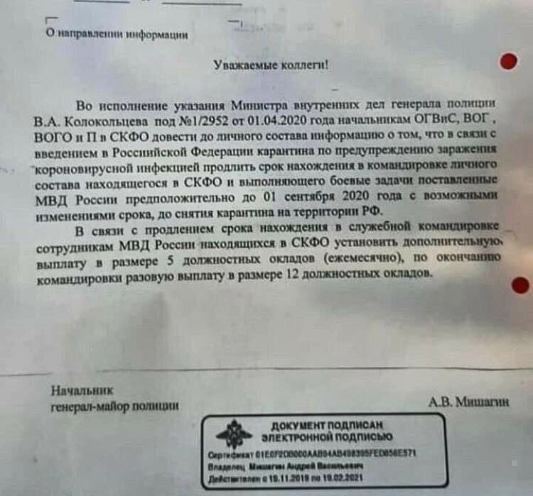 В сети Интернет опубликовано письмо Генерал-майора полиции А.В. Мишагина, якобы об исполнении Вашего указания, о доведении до сведения личного состава, некоторой информации. Согласно этого письма, во-первых, на территории нашей страны введен режим Карантина по предупреждения заражения короновирусной инфекции. Во-вторых, срок нахождения в командировке личного состава находящегося в Северокавказском федеральном округе и выполняющего боевые задачи поставленные МВД России продлевается предположительно до 1 сентября 2020 года, с возможным изменением срока, до снятия карантина на территории РФ. В третьих, указанным сотрудникам органов внутренних дел установлены дополнительные ежемесячные выплаты, в размере 5 должностных окладов и разовая выплата по окончанию командировки, в размере 12 окладов.