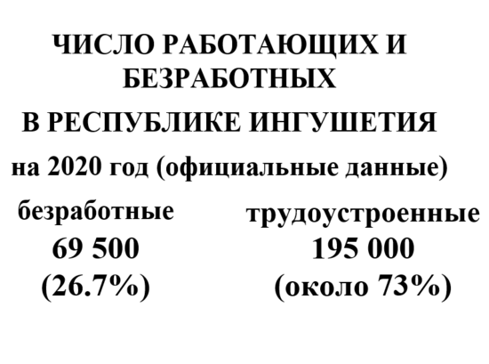 Согласно официальным данным, численность рабочей силы в Ингушетии на сегодняшний день, составила почти 265 тысяч человек. Именно от этой цифры и происходит исчисление уровня безработицы, от нее просто отнимают число якобы работающих, а это по официальным данным около 195 тысяч человек. Но есть другие статистические данные, пусть и очень сомнительные. По системе ГАС-выборы, в Ингушетии всего 226 тысяч избирателей, т.е. людей, достигших совершеннолетия. Мы сейчас не будем обращать внимание на утверждения некоторых жителей республики, о том, что имена их умерших родных до сих пор находятся в списках при каждом голосовании, а просто примем их как официальные данные. И возникает вопрос, откуда взялась разница в этих цифрах в 39 тысяч человек? В число всей рабочей силы республики, включается молодая часть населения, в возрасте от 15 до 18 лет, так как по закону они обладают правом трудоустройства на определённых условиях. Берем статистику родившихся в Ингушетии в 2002, 2003, 2004 годах (ведь с учетом всех сроков и периодов, вероятно именно они подпадают под эти возрастные группы) и получаем немногим больше 20 тысяч человек. Остается еще 18 тысяч человек и вряд ли это объективная цифра, которая сформирована из «мигрировавших» в Ингушетию молодых людей этой возрастной группы. По сути, завышая исходные данные якобы имеющейся рабочей силы, а в след за ними и число якобы трудоустроенных, число реально не имеющих работу, будет казаться меньше, естественно если указывать их в процентах, а не в натуральном количестве. Согласитесь, 26% меньше режет слух, чем 69 500 безработных.