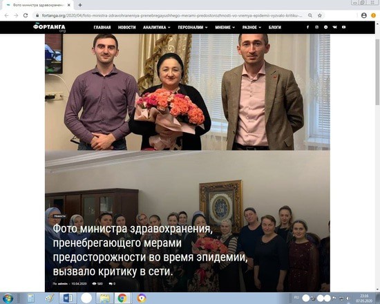 Здесь речь конечно же в первую очередь об уже нашумевшем поздравлении коллективом Минздрава с получением нобелевской премии в области медицины утверждением в должности министра Заремы Льяновой. Но и глава республики Махмуд-Али Калиматов внес свой вклад в это дело. С 1 мая в республике введен рекомендательный масочный режим, но сам глава появляется без маски сегодня на месте прорыва дамбы в сельском поселении Троицкое. Кстати если я не ошибаюсь, именно он и рекомендовал жителям республики носить защитные маски, как оказалось напрочь забыв о необходимости личного примера. Я не буду сейчас писать и об отсутствии каких-либо мер поддержки населения республики, которые позволили бы ему, в это тяжелое время (и с точки зрения семейного бюджета тоже), оставаться дома на самоизоляции.