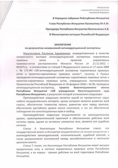 Муцольговым Русланом Адамовичем, аккредитованным в качестве независимого эксперта антикоррупционной экспертизы нормативных правовых актов и проектов нормативных правовых актов распоряжением Минюста России от 21.12.2012 г. №2875-р, в соответствии со статьей 5 Федерального закона от 17 июля 2009 г. № 172-ФЗ «Об антикоррупционной экспертизе нормативных правовых актов и проектов нормативных правовых актов»*, пунктом 4 Правил проведения антикоррупционной экспертизы нормативных правовых актов и проектов нормативных правовых актов, утвержденных постановлением Правительства Российской Федерации от 26 февраля 2010 г. № 96, проведена антикоррупционная экспертиза, проекта Конституционного закона Республики Ингушетия «Об упразднении Конституционного суда Республики Ингушетия», в результате которой установлено следующее.
