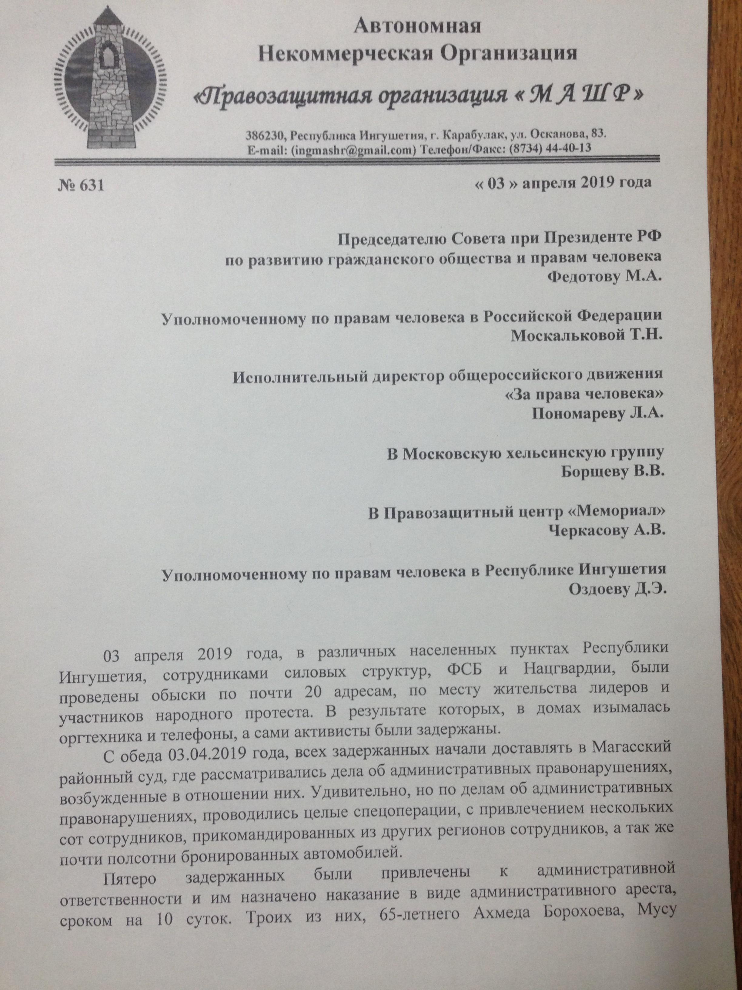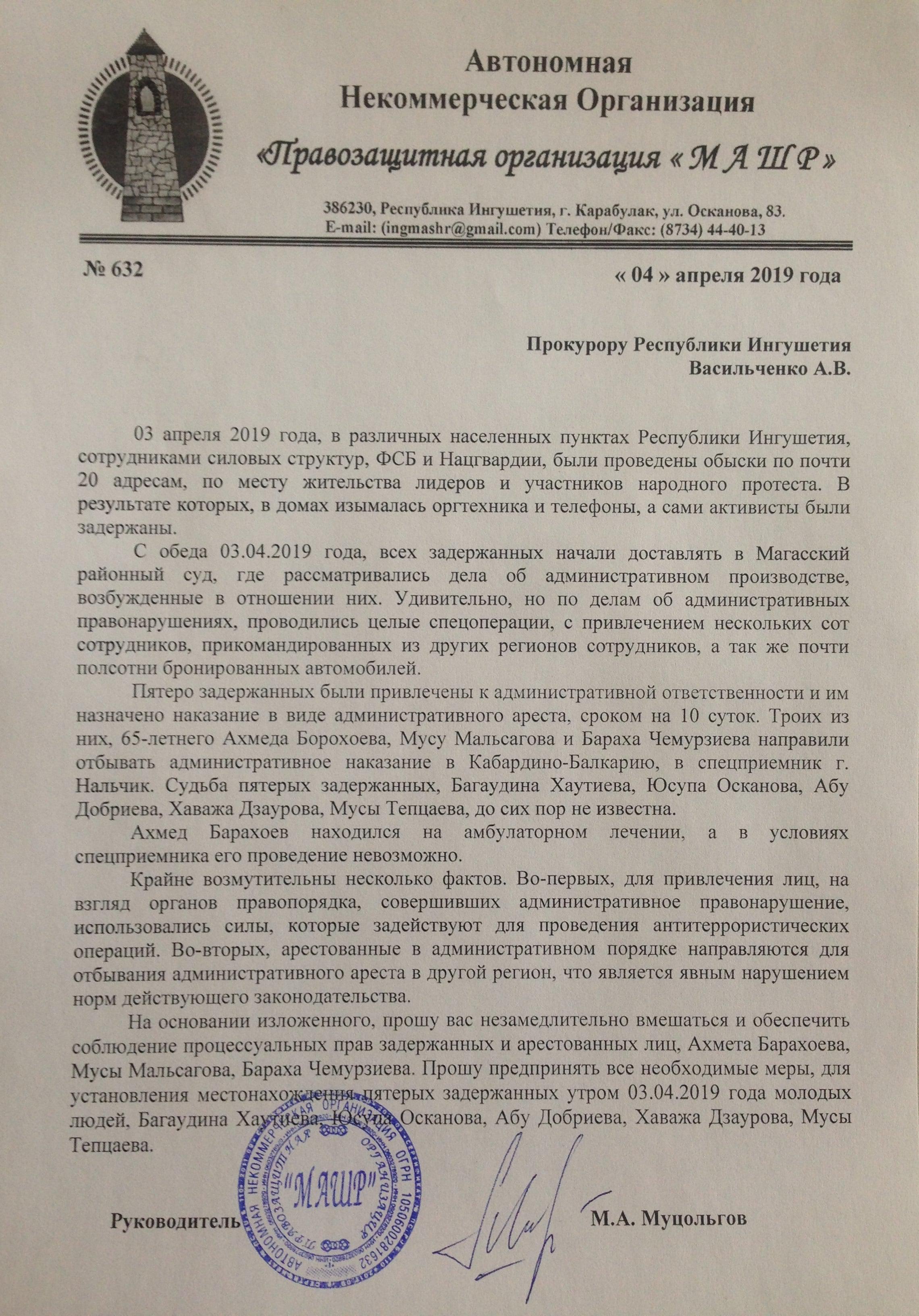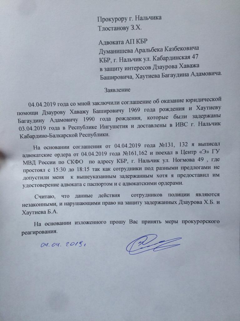 Главная / Блогеры "Кавказского Узла" / Ингуш, правозащитник Магомед Муцольгов Все записи и публикации блогера Ингуш, правозащитник Магомед Муцольгов Всего публикаций: 2133 21:27, 26 апреля 2019 11 комментарий Сила закона? Ровно 28 лет назад, 26 апреля 1991 года, верховный советом был принят Закон Российской Федерации «О реабилитации репрессированных народов». Этот закон стал одним из самых гуманных актов современной России, но реализовать его в полном объеме, власть так и не удосужилась. 15:08, 23 апреля 2019 Кациев задержан, репрессии продолжаются Сегодня пришла новость о задержании гражданского активиста Хасана Кациева. Задержан он был днем 23 апреля в Минеральных водах. Хасан Кациев участник народного протестного движения, с самого его начала, в августе 2018 года. С тех же пор он подвергается давлению и репрессиям со стороны власти. У него неоднократно проходили обыски, в том числе и 2 октября. Тогда, в доме Хасана и еще нескольких гражданских активистов, как и в доме моего младшего брата, силовики провели обыски. 20:50, 21 апреля 2019 Отказ Правительства Ингушетии согласовать митинг будет обжалован (фото) Несколько дней назад, мы, представители Ингушского комитета национального единства, в Правительство Ингушетии подавали уведомление о проведении митинга. Вчера мне поступил ответ из Правительства, в котором говорится об отказе согласования митинга в Магасе, который мы планировали провести в годовщину принятия Закона «О реабилитации репрессированных народов», 26 апреля. 23:12, 19 апреля 2019 Старейшине Ахмеду Барахоеву – 65! С 3 апреля, в местах принудительного содержания находится много лидеров и активистов народного протеста. С каждым днем их число только растет, ведь волна массовых репрессий, развернутых силовиками и региональной властью, захлестнула республику. На сегодняшний день количество жертв этих репрессий перевалило за 70 человек. В репрессиях задействованы тысячи сотрудников силовых структур, следственных, надзорных и судебных органов. 22:55, 17 апреля 2019 22 комментария Власть требует ныне модных извинений от целого народа или хотя бы, такой видимости Остановившие Хасана полицейские из ЦПЭ, спрашивали еще и про Исмаила Нальгиева, который так же как я и Хасан, является заявителем в уведомлении о проведении митинга. Спустя час Хасан уже сидел в кабинете полицейских из городского отдела полиции Магас, которые составляли в отношении него материал об административном правонарушении, которое якобы совершил Хасан. Вменили ему нахождение на территории автопарковки у НТРК «Ингушетия» в Магасе утром 27 марта. Спустя еще пару часов, он получил уже в Магасском райсуде постановление о привлечении его к административной ответственности в виде штрафа в размере 20 тысяч рублей. 13:14, 16 апреля 2019 22 комментария СРОЧНО!!! В Назрани задержан Хасан Кациев (фото) Только что, поступила информация, что в Назрани, в районе рынка «Ковчег» сотрудниками силовых структур, был задержан и увезен в неизвестном направлении один из организаторов предстоящего митинга Хасан Кациев. Подошедшие к нему силовики представились сотрудниками ЦПЭ и сказали, что намерены вручить ему предостережение в связи с предстоящим митингом, где он выступил в качестве одного из организаторов. 20:50, 15 апреля 2019 Уведомление о проведении митинга в Магасе (фото) Сегодня, 15 апреля, в Правительство Республи