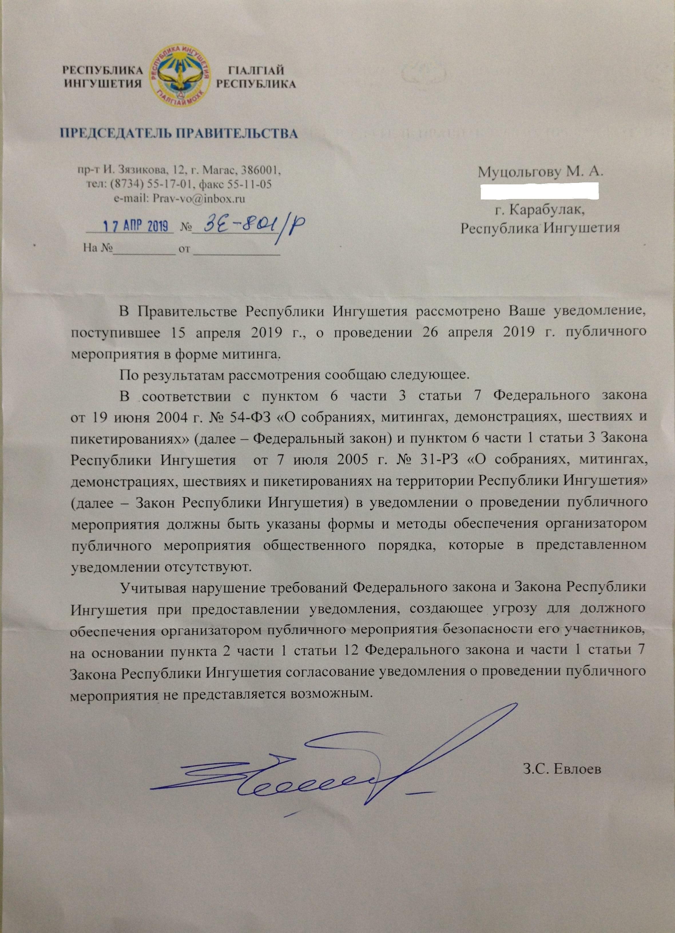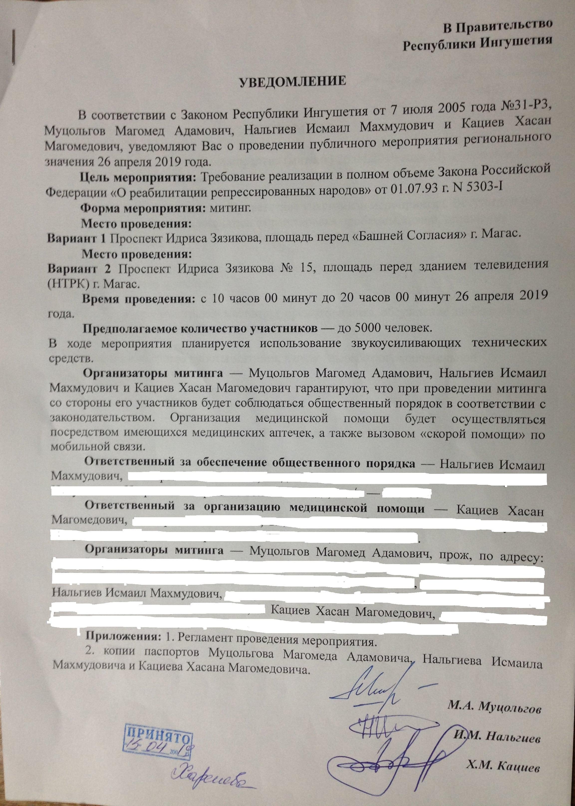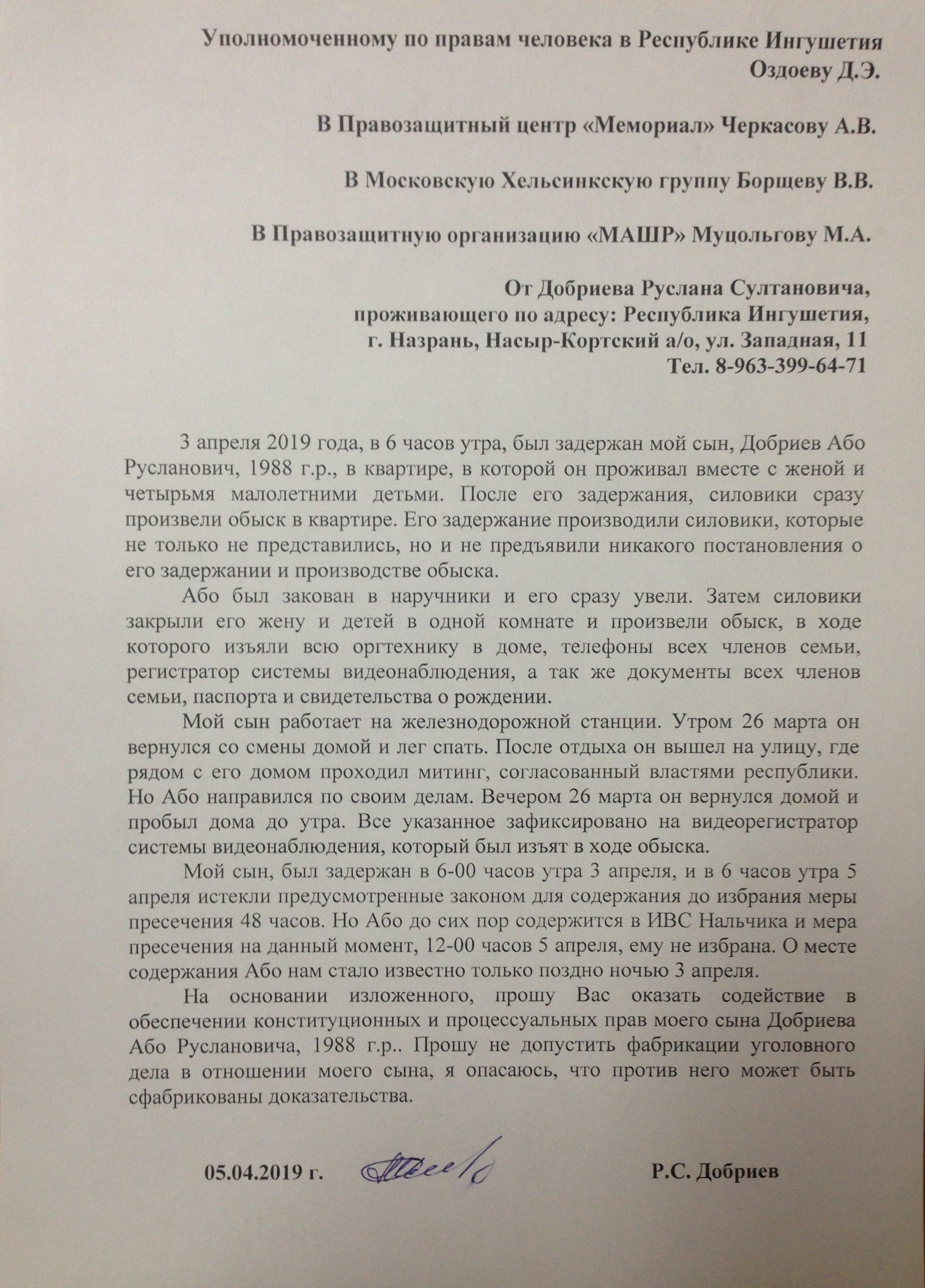 Главная / Блогеры "Кавказского Узла" / Ингуш, правозащитник Магомед Муцольгов Все записи и публикации блогера Ингуш, правозащитник Магомед Муцольгов Всего публикаций: 2133 21:27, 26 апреля 2019 11 комментарий Сила закона? Ровно 28 лет назад, 26 апреля 1991 года, верховный советом был принят Закон Российской Федерации «О реабилитации репрессированных народов». Этот закон стал одним из самых гуманных актов современной России, но реализовать его в полном объеме, власть так и не удосужилась. 15:08, 23 апреля 2019 Кациев задержан, репрессии продолжаются Сегодня пришла новость о задержании гражданского активиста Хасана Кациева. Задержан он был днем 23 апреля в Минеральных водах. Хасан Кациев участник народного протестного движения, с самого его начала, в августе 2018 года. С тех же пор он подвергается давлению и репрессиям со стороны власти. У него неоднократно проходили обыски, в том числе и 2 октября. Тогда, в доме Хасана и еще нескольких гражданских активистов, как и в доме моего младшего брата, силовики провели обыски. 20:50, 21 апреля 2019 Отказ Правительства Ингушетии согласовать митинг будет обжалован (фото) Несколько дней назад, мы, представители Ингушского комитета национального единства, в Правительство Ингушетии подавали уведомление о проведении митинга. Вчера мне поступил ответ из Правительства, в котором говорится об отказе согласования митинга в Магасе, который мы планировали провести в годовщину принятия Закона «О реабилитации репрессированных народов», 26 апреля. 23:12, 19 апреля 2019 Старейшине Ахмеду Барахоеву – 65! С 3 апреля, в местах принудительного содержания находится много лидеров и активистов народного протеста. С каждым днем их число только растет, ведь волна массовых репрессий, развернутых силовиками и региональной властью, захлестнула республику. На сегодняшний день количество жертв этих репрессий перевалило за 70 человек. В репрессиях задействованы тысячи сотрудников силовых структур, следственных, надзорных и судебных органов. 22:55, 17 апреля 2019 22 комментария Власть требует ныне модных извинений от целого народа или хотя бы, такой видимости Остановившие Хасана полицейские из ЦПЭ, спрашивали еще и про Исмаила Нальгиева, который так же как я и Хасан, является заявителем в уведомлении о проведении митинга. Спустя час Хасан уже сидел в кабинете полицейских из городского отдела полиции Магас, которые составляли в отношении него материал об административном правонарушении, которое якобы совершил Хасан. Вменили ему нахождение на территории автопарковки у НТРК «Ингушетия» в Магасе утром 27 марта. Спустя еще пару часов, он получил уже в Магасском райсуде постановление о привлечении его к административной ответственности в виде штрафа в размере 20 тысяч рублей. 13:14, 16 апреля 2019 22 комментария СРОЧНО!!! В Назрани задержан Хасан Кациев (фото) Только что, поступила информация, что в Назрани, в районе рынка «Ковчег» сотрудниками силовых структур, был задержан и увезен в неизвестном направлении один из организаторов предстоящего митинга Хасан Кациев. Подошедшие к нему силовики представились сотрудниками ЦПЭ и сказали, что намерены вручить ему предостережение в связи с предстоящим митингом, где он выступил в качестве одного из организаторов. 20:50, 15 апреля 2019 Уведомление о проведении митинга в Магасе (фото) Сегодня, 15 апреля, в Правительство Республи