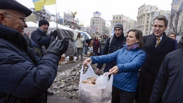 Все помнят  Вику Нуланд, раздающую булочки и печеньки в центре Киева, гордым борцам за прогресс и демократию.