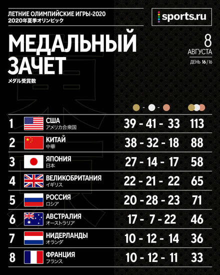 – Станислав Поздняков (глава Олимпийского комитета России – Sports.ru) доволен итогами Олимпиады в Токио. Он считает общее количество медалей, а столько у нас не было с Игр-2004 в Афинах. Сборная России – третья в Токио по количеству наград.