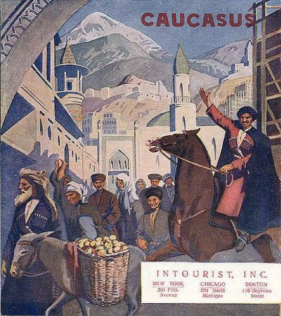 Таким рисовал Интурист Кавказ для иностранцев -жизнерадостным, устремленным вперед (судя по взмаху руки джигита на переднем плане), но и традиционным, хотя...женщины уже идут "на равных" с мужчинами. А на фоне гор и мечетей -"леса"; скорее всего, намек на какую-нибудь масштабную стройку. Плакат 1950-х гг.