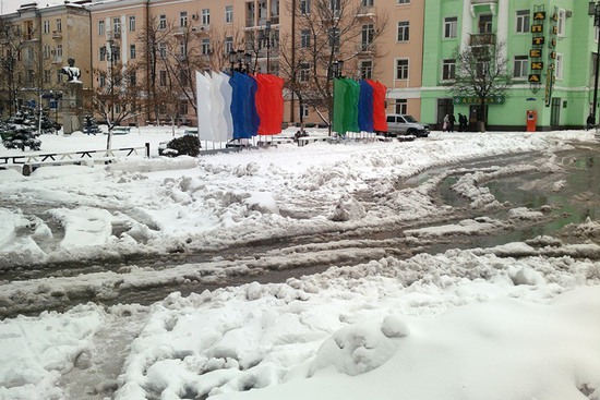 В связи с 23 февраля у нас на площади, среди всего этого ужаса, этих глыб снега, начали ставить флажки к празднику. Это просто гениально! "Подарим людям праздничное настроение!"