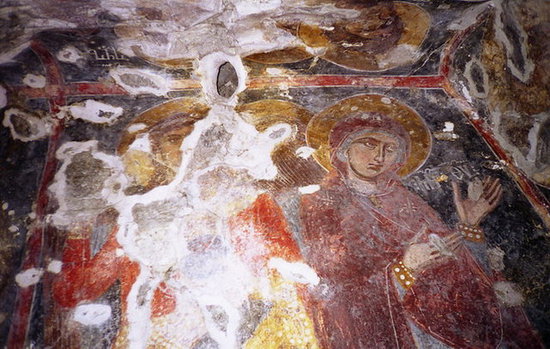 Итак, часовня погружена в полумрак. Свет проникает в нее только через три щелевидные окна. Когда глаза привыкают к темноте, мы видим фрески. Местами обвалившиеся или же сбитые.