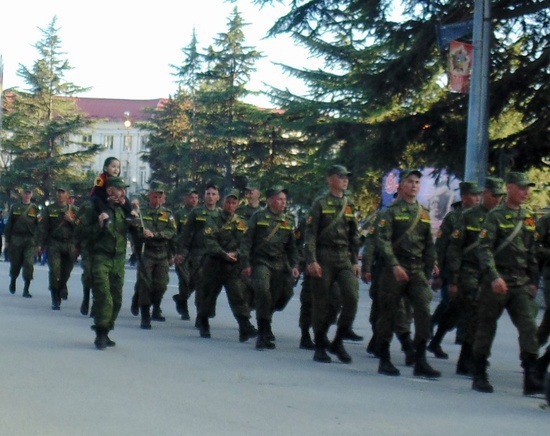Вечером по дороге домой застал самый конец репетиции парада. Не буду опережать события, писать и помещать фотографии. Скажу только что все работали с полной самоотдачей. Парад уверен, будет как во Славу так и на славу. Посмотрите сами - некоторым пришлось совмещать репетицию с присмотром за ребёнком.