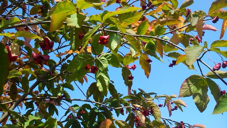 Вначале думал что это красные цветы, оказалось - плоды. Не знаю какого дерева