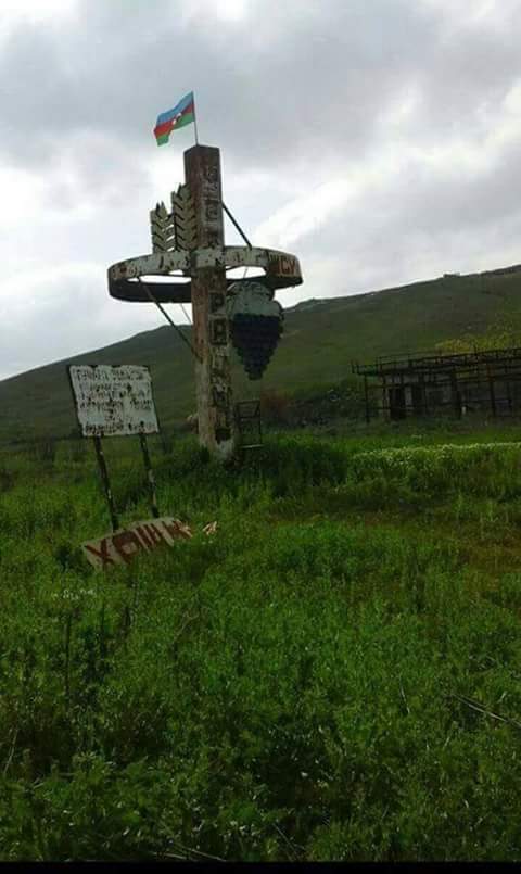 Азербайджанские солдаты фотографируются у советских указателей, свидетельствующих о принадлежности этих земель советскому Азербайджану