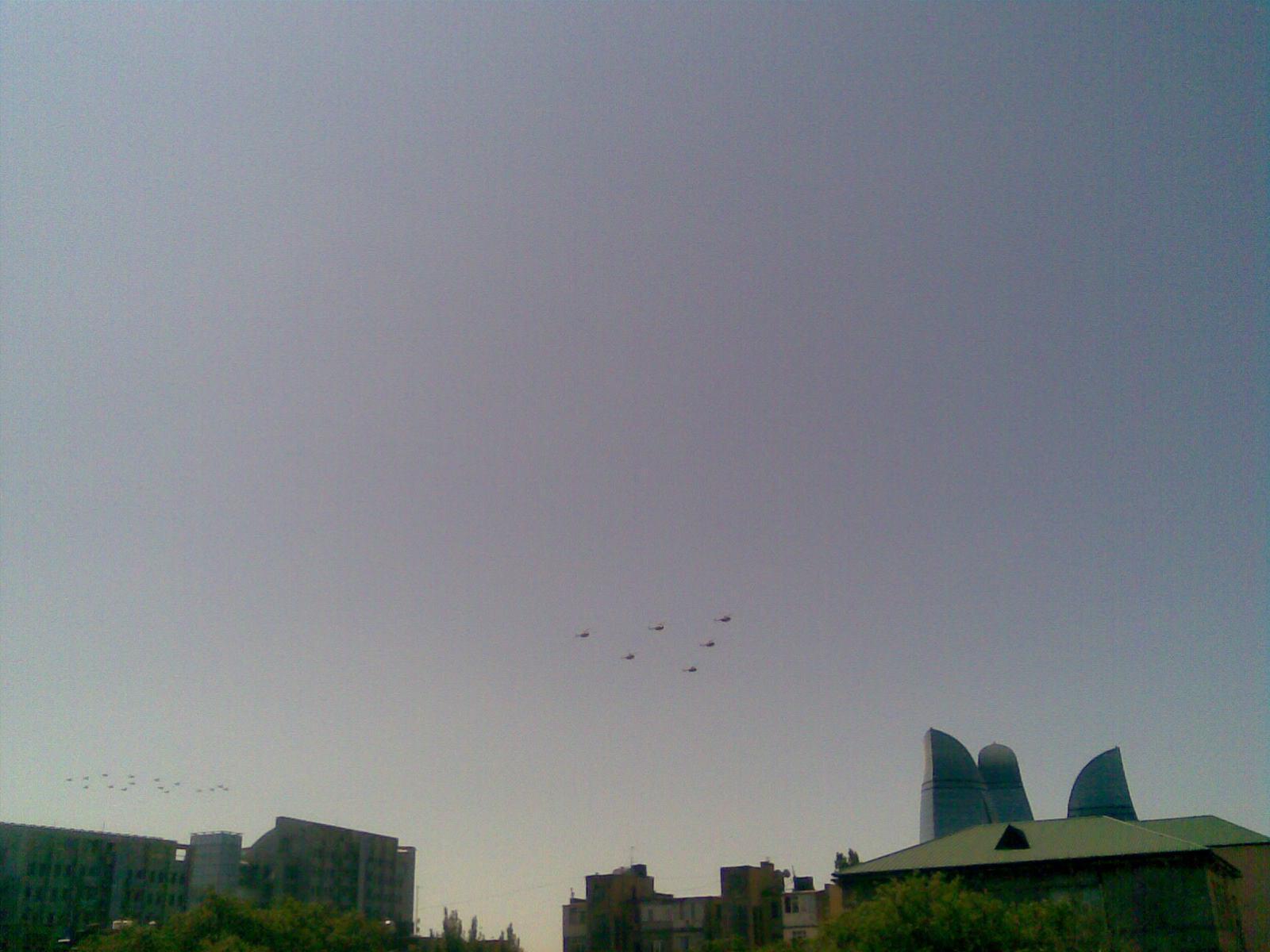 Утром над моим домом пролетели эскадрильями различного типа самолеты и вертолеты военной авиации Азербайджана. Летчики готовятся к военному параду в День вооруженных сил 26 июня.