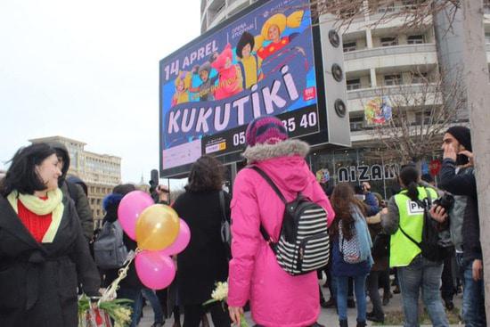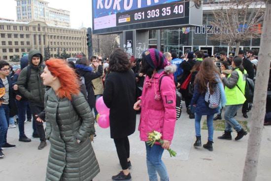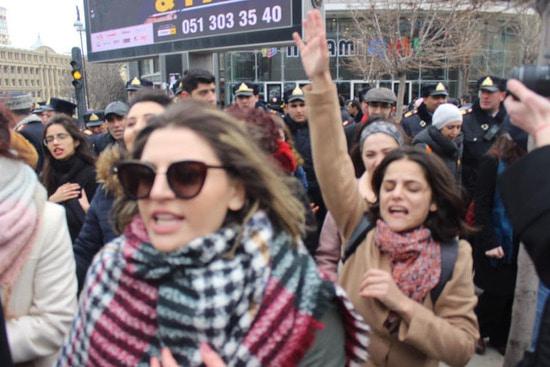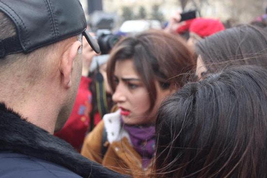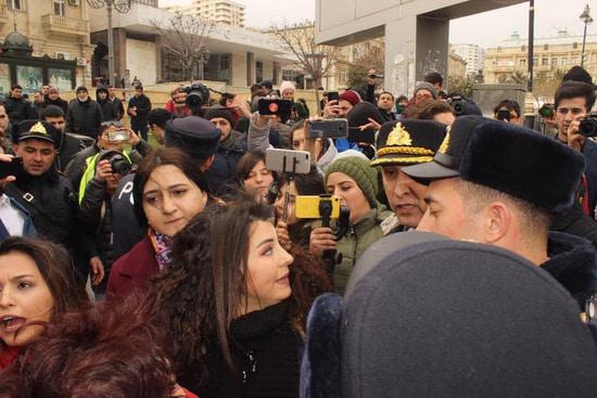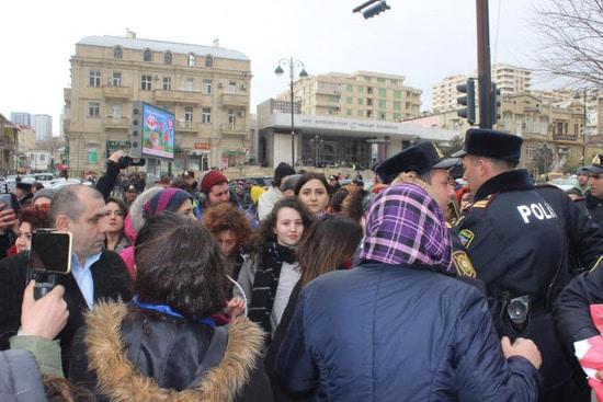 Бакинская власть запретила группе женщин провести шествие, которое женщины хотели посвятить призыву бороться  с насилием мужчин. Почему запрет? Не знаю. Понятно, что вреда от разгона демонстранток мы получили больше, чем пользы от бессмысленного запрета. Вряд ли запретители не знали, что разгон мирной демострации будет использован потом против Азербайджана. Ноу-хау вчерашнего события в том, что полиция блокировала выход женщин на планируемый маршрут демонстрации, а кинулись их бить...  уборщицы. Одна боевая уборщица попалась на глаза фотокорреспонденту, см. последний снимок. Фотографировала и выставила в сеть журналист Гюльназ Гамбарли.