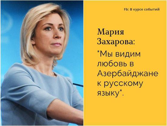 "Мы видим и интерес, и неподдельную любовь в Азербайджане к русскому языку, как языку страны, народа, который является другом Азербайджанской Республики, и, как мне кажется, источнику собственного вдохновения. И такое отношение связано с особым переплетением наших культур, таким, что разделять их даже не нужно, да и вредно", - сказала представитель МИД России Мария Захарова.