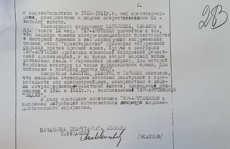 – Лично мне известно, что находящийся в Бухаресте Саргсян Епрем два раза ездил в Берлин по делам разведки и вербовки. Саргсян является ближайшим другом Дро и осведомлён обо всех его делах в пользу немецкой разведки.