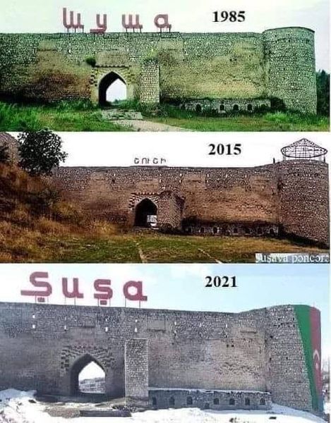 И еще кажется, наши вовремя начали войну в прошлом году. Потому, что еще немного времени, и весь мир узнал бы, что Шушинская крепость на самом деле - армянский храм, древний, с соответствующим их церковной архитектуре куполом. Скелет фальшкупола стоял на крепостной башне когда наши воины в нее вошли. см фото, там для сравнения показана армянская церковь в Саратове.
