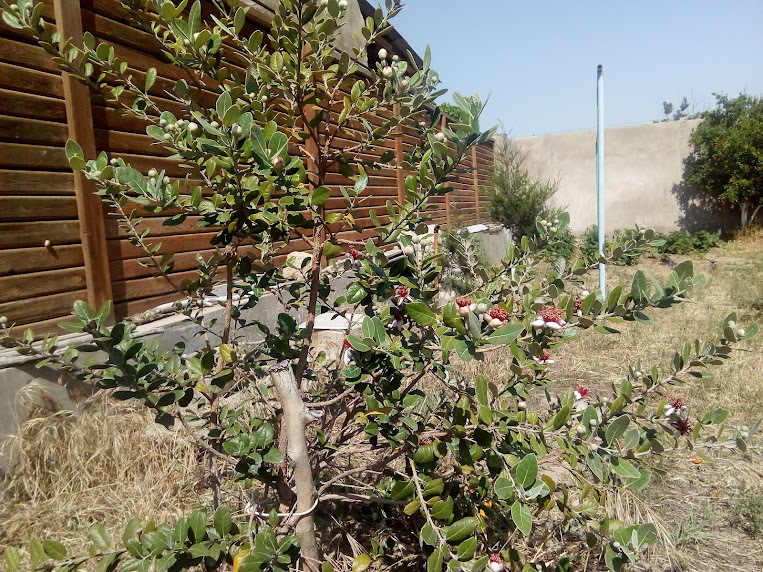 А это цветы фейхоа. Удивительная красота, впервые вижу в этом году. Вместо каждого цветка осенью будет полный йода плод похожий на маленький огурчик. В РФ не растет.