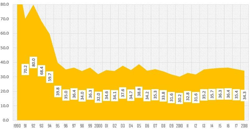 В 2012 году Иванишвили обещал восстановить грузинское сельское хозяйство, в том числе благодаря раскрытию российского рынка и инвестиции в 1 млрд долл. Инвестиция оказалась гораздо меньше, а российский рынок был открыт не полностью, кроме того не удалось решить структурные проблемы – на грузинском рынке по-прежнему доминируют европейские торговые сети и турецкие овощи. В результате сельское хозяйство сократило свою долю в ВВП с 8.6% в 2012 году до 8.2% в 2017 году. За 2013-2018 гг. накопленный рост валовой добавленной стоимости сектора натурального хозяйства вырос на 8.64% или на 1.4% в год, чего совершенно недостаточно для выправления той ситуации, которая сложилась в Грузии после получения ею независимости. Для иллюстрации ниже прилагаю график динамики объема сельскохозяйственной продукции в Грузии. (1990=100).