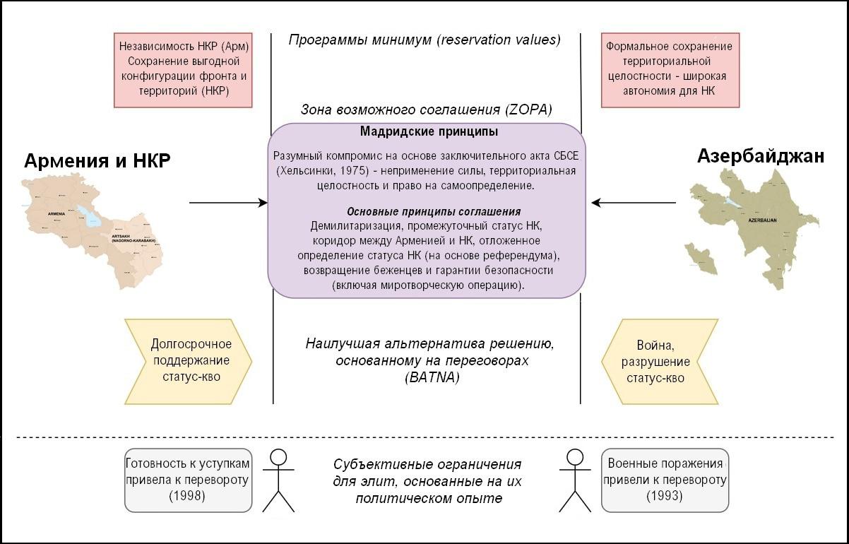 Другим понятием из теории переговоров является Программа минимум (Reservation value) – это та точка, которая отражает минимально допустимую для стороны позицию, после которой она фактически прекратит вести переговоры. Между Reservation Values обоих сторон находится Зона возможного соглашения (Zone of Possible Agreement / ZOPA), которая определяется наложением допустимых с обоих сторон компромиссов. Формально зона возможного соглашения соответствует Мадридским принципам, которые были согласованы к 2007 году в рамках Минской Группы ОБСЕ и которые формально приняли обе стороны, подтвержденные совместным заявлением со-председателей МГ ОБСЕ в 2009 году и Казанским документом от 2011 года. Стоит помнить также о Майндорфской декларации 2008 года, которая стала результатом активизации переговорных усилий Медведева, но так и не привела к сколько-либо серьезным подвижкам в переговорах.