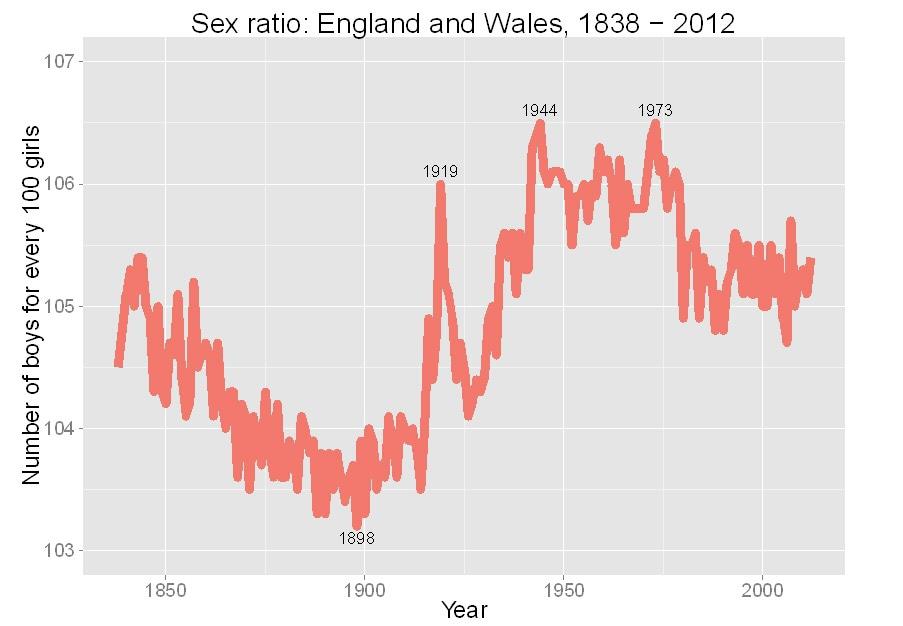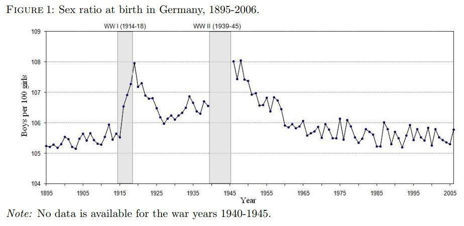 Этот феномен исследован на множественных примерах, в том числе, Германии (Dirk Bethmann, Michael Kvasnicka, Why Are More Boys Born During War?), Великобритании и др. Ниже привожу статистику соотношения полов при рождении в этих странах.