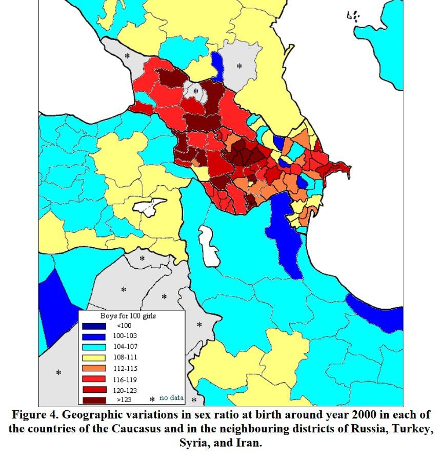 Кстати, карта соотношения полов при рождении около 2000 года тоже визуально показывает корреляцию диспропорции полов с конфликтностью на Кавказе (источник – Mesle, Vallin, Badurashvili).
