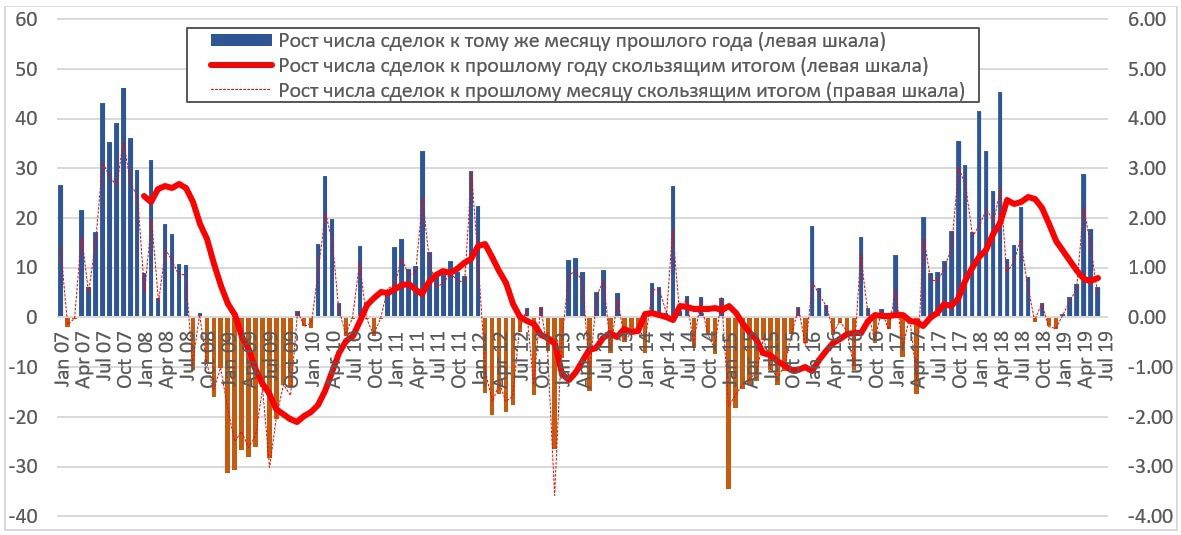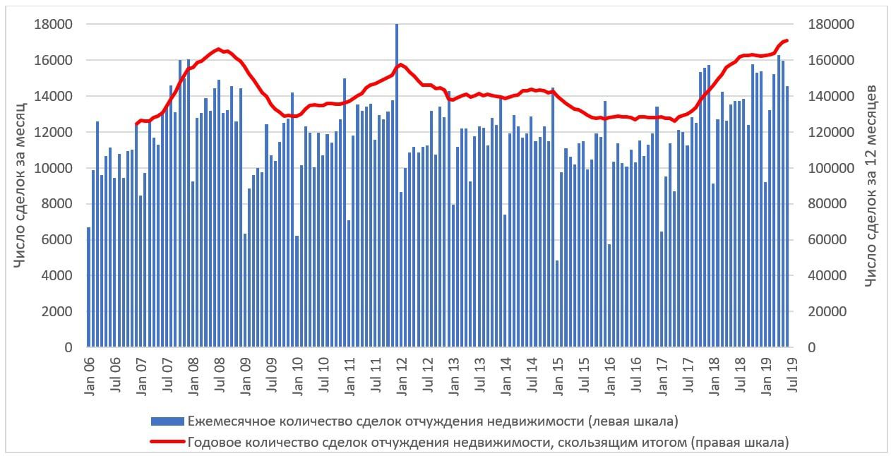 На этом графике можно видеть довольно много чего, включая сезонный фактор, влияние отдельных политических событий, общеэкономических тенденций, а также эхо принятия тех или иных законов, влияющих на рынок. Все это влияет на синие столбцы. Однако результирующая линия (красная) уже отражает количество сделок за скользящий 12-месячный период, например, с апреля 2006 по март 2007 года и так далее. С мая 2017 года, после парламентских выборов, мы видим тенденцию к росту, причем этот рост был достаточно стремительным и локальный пик - в марте-апреле 2018 года, после чего график более пологий и восстанавливает рост уже в 2019 году. В первой половине 2019 года красная линия впервые превзошла докризисные показатели 2008 года.
