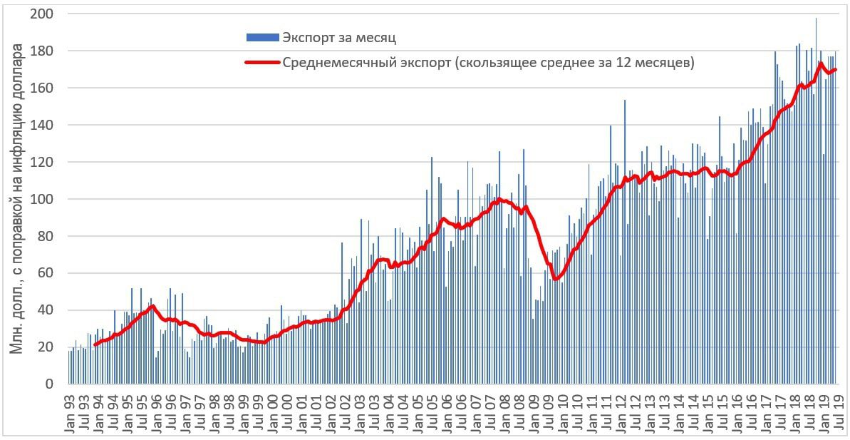 График 5. Динамика экспорта из Армении в 1993-2019 гг. (с поправкой на девальвацию доллара)