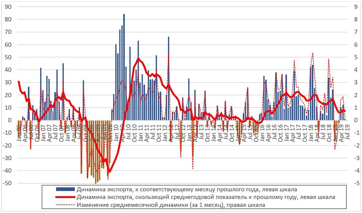 Итак, начиная с апреля-мая 2018 года, жирная красная линия медленно, хоть и с колебаниями, идет вниз. Спад темпов ускорился в начале 2019 года и достиг самого низкого значения за прошедшие три года. Это все еще не критично, но необходимо учитывать, что во многих чувствительных отраслях уже никакого роста нет, а уже фиксируется спад. Итого, если в феврале-апреле 2018 года рост экспорта скользящего года составлял 20%, то в последние месяцы – в среднем около 7%.