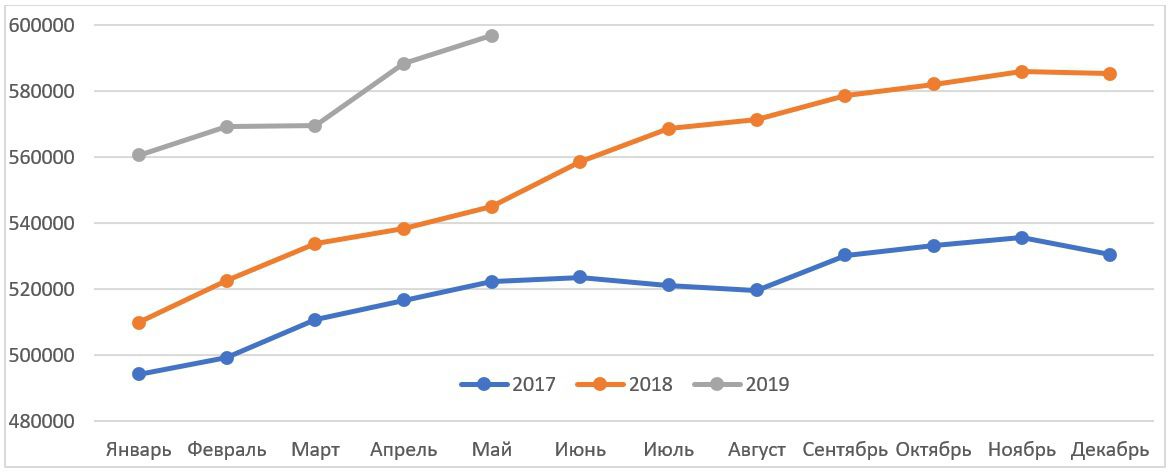 Об этом нам могут сказать данные прошлых лет. Так, если в 2017 году заметных изменений касательно формальной регистрации работников не было, то сезонные колебания отражены именно на линии 2017 года. Увеличивающийся между 2017 и 2018 годами разрыв начиная с июня 2018 года вызван регистрацией сотрудников, занятых в прошлом в теневом секторе. Соответственно, разрыв между данными 2017 и 2018 года в январе-мае вызван ростом числа рабочих мест, а затем – также и числом новых зарегистрированных работников. Если число занятых действительно увеличилось на 10.5 тысяч человек, то до конца года число зарегистрированных сотрудников сильно не изменится и будет колебаться около 600 тысяч. Сезонные колебания в этом случае будут примерно повторять динамику 2017 года и к концу года мы будем иметь рост на те самые 10 тысяч занятых, если конечно ничего дополнительно не изменится, что тоже возможно.