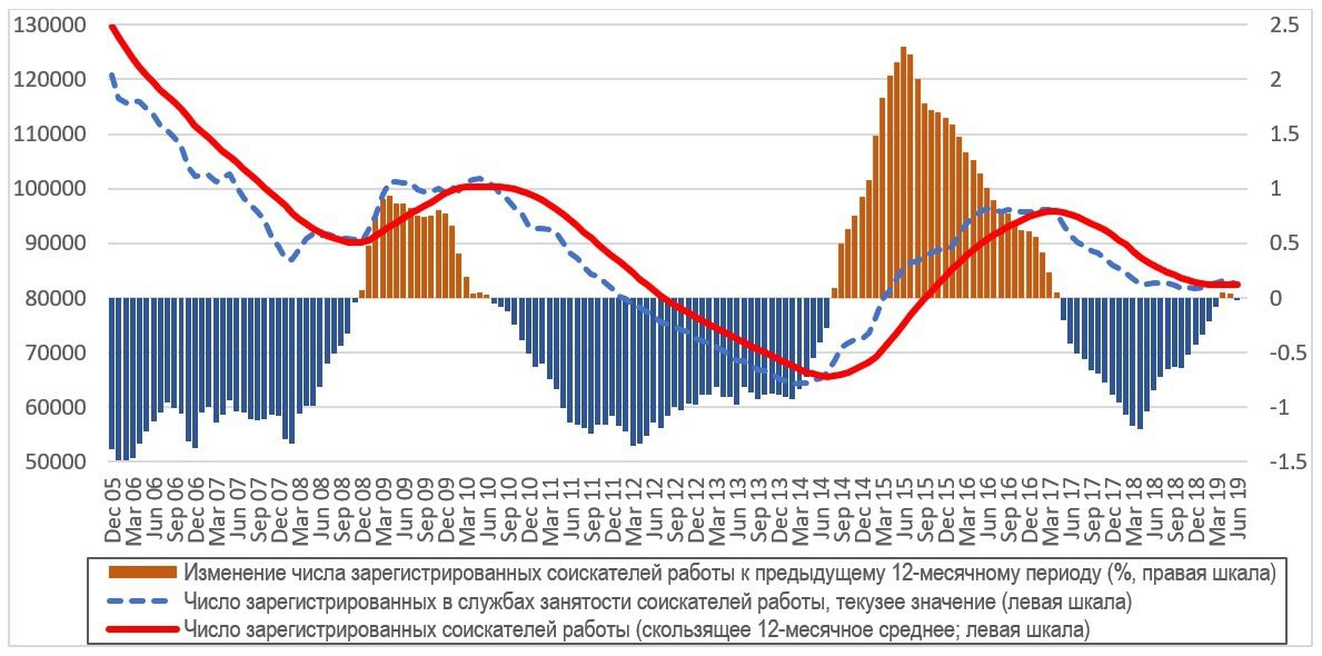 Рынок труда, как и рынок недвижимости, заранее демонстрирует экономические тенденции, что мы и видим на данном графике. Это означает, что он довольно гибко реагирует на общеэкономическую ситуацию. Начиная с апреля тенденции изменения на рынке труда изменяются (см. столбцы на графике) и сокращение безработицы замедляется.