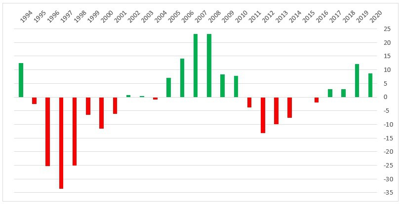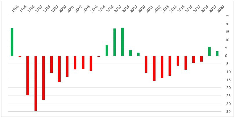 График 1. Опережение (отставание) Армении над Грузией в процентах. ВВП на душу населения, в текущих ценах, по обменному курсу, по данным МВФ на конец 2019 года