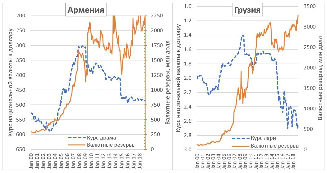 На графике выше мы видим схожие траектории и схожие ошибки властей, допущенные в 2000-е. Тогда казалось, что приток валюты столь велик, что можно допустить и ревальвации местной валюты, и роста валютных резервов, тогда как в действительности эти тренды друг другу противоречат. И во второй половине обоих графиков это заметно. Также заметно, что каждый раз обвал валютных резервов предшествовал обвалу местной валюты в Армении (к чему еще и добавлялся рост внешнего долга). За счет заемных средств Армения увеличивала размер валютных резервов, но тем не менее, рост валютных резервов по сравнению с 2008 годом вплоть до 2018 года был не очень значительным.