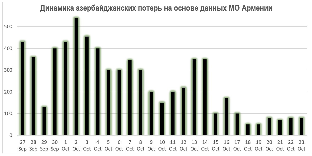В последние дни интенсивность боев снижается. По мере ухудшения погоды и наступления зимы она дополнительно снизится. Об этом свидетельствуют данные МО Армении о ежесуточных потерях на стороне Азербайджана. На основе этих данных я составил график с примерной динамикой числа погибших.