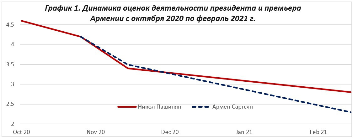 Как мы видим, преимущество Пашиняна перед остальными деятелями на данный момент все еще высоко, но оно уже не является «комфортным», к примеру, Гагика Царукяна он опережает лишь на 0.6 баллов. Учитывая, что во время войны уровень поддержки Пашиняна составлял 4.6 баллов, мы видим сокращение на 2/5, особенно резкое после подписания капитуляционного «Заявления» от 9 ноября. В последнее время, судя по всему, поднялся рейтинг второго президента Армении Кочаряна, объявившего о возвращении в активную политику.