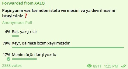 Маски сброшены. Турция официально поддержала Пашиняна. В комментариях к моей записи, азербайджанцы (все до одного) представляют позицию Пашиняна во внутренней политике. Объявили политическую элиту Армении "Робосержами", атакуют армию, говорят про коррупцию, цитируют маргиналов из Армении, угрожают новой войной и всесторонне поддерживают Пашиняна. Кстати в азербайджанском сегменте телеграма был опрос, должен ли Пашинян уйти и 79% выступили против и лишь 4% - за. Хотя вроде бы это Пашинян их враг и его обвиняли во всех грехах. Картинка - слева. Но это ладно. Важнее - политические заявления.