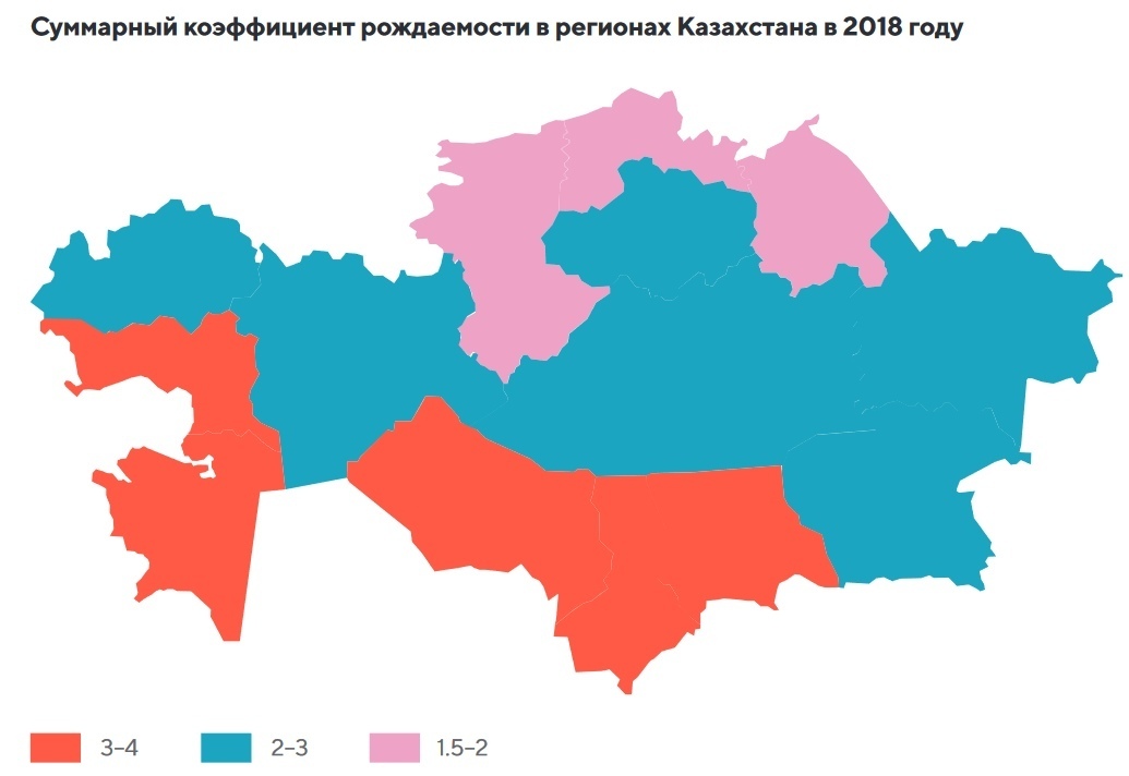 На самом деле, это не критические показатели: в Казахстане очень низкая плотность населения и там есть что осваивать, но стоит учитывать географическую неоднородность рождаемости в Казахстане. На юге и западе Казахстана рождаемость на 15-40% выше среднего и это по современным меркам очень много. Интересно, что в ряде регионов рождаемость в городах выше, чем в селах, что вызвано интенсивной миграцией сельского населения в города.