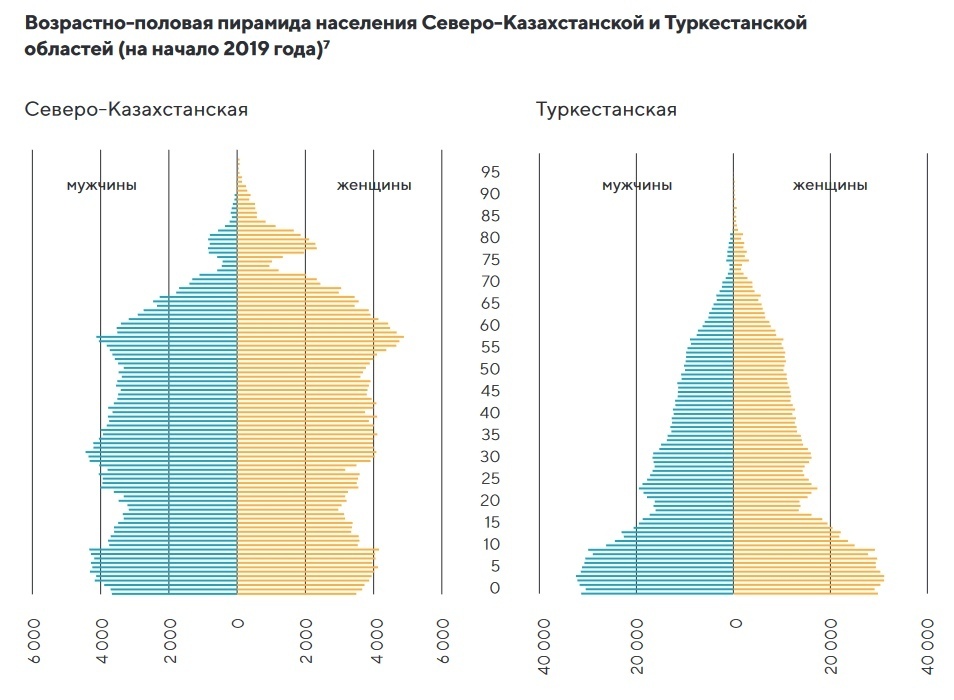 Сравнение возрастной структуры в Северо-Казахстанской и Туркестанской областях. Обратите внимание также на количество по горизонтальной шкале. Географически это выглядит так: