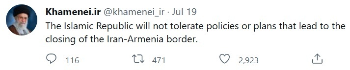 Недавно верховный лидер Ирана аятолла Хаменеи сделал заявление в своем твиттере о том, что Иран не допустит любую политику, направленную на закрытие армяно-иранской границы.