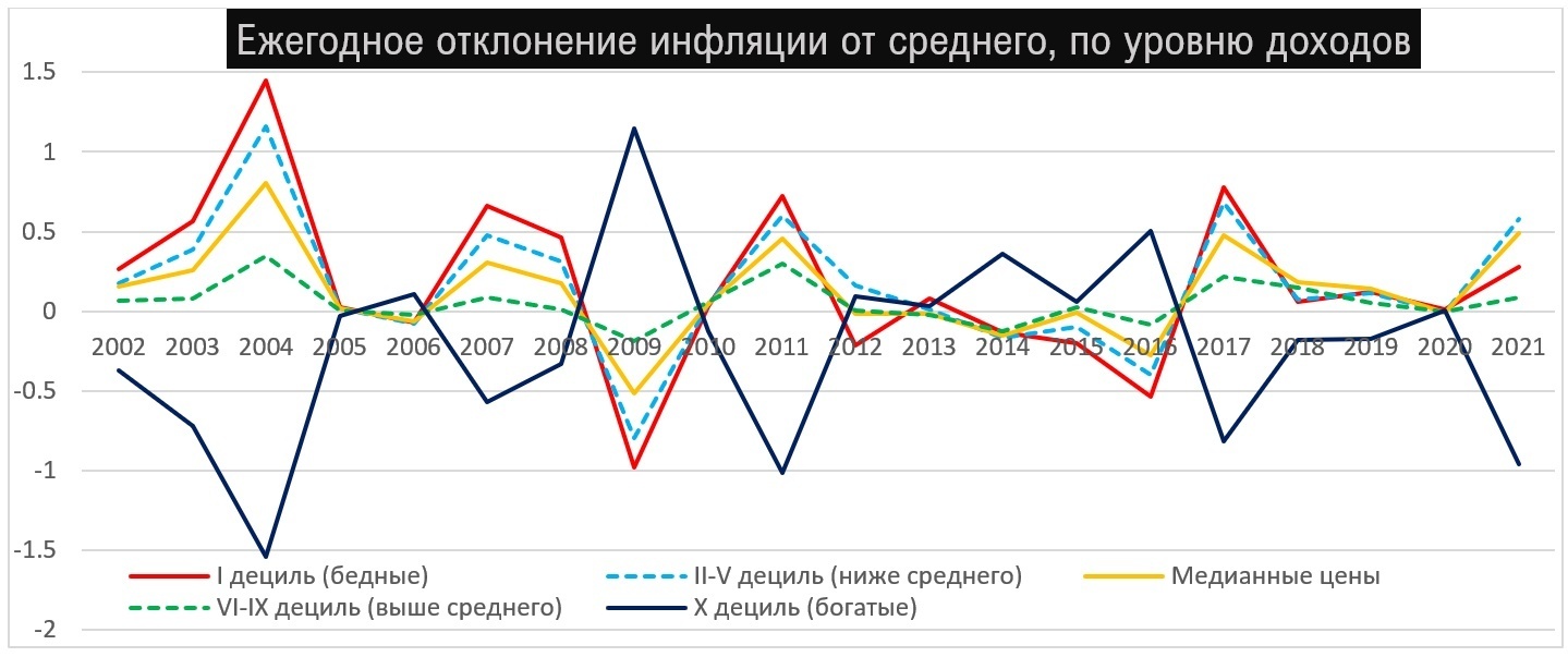 Как мы видим, вес самого богатого дециля в потреблении столь высок, что он «тянет» всю инфляцию вниз, хотя опуская ее на 0.12% в год ниже медианной. В целом же закономерность такова, что чем больше уровень дохода группы, тем меньше росли для нее цены, хотя эта закономерность становится сколько-либо заметной уже при доходах выше среднего – с VII-VIII децилей. Отмечу также, что подсчет сделан на основе трех субиндексов цен (цены на продовольствие, включая безалкогольные и алкогольные напитки, а также табачную продукцию; цены на непродовольственные товары; цены на услуги). Было бы предпочтительнее иметь данные как минимум по основным подкатегориям как в продовольствии, так и в услугах, но, к сожалению, у нас нет достаточных данных – а считать по отдельным годам, когда такие данные были доступны, не имеет смысла, поскольку каждый отдельный год может быть случайным отклонением, тенденция видна на более длительной дистанции. Чтобы сделать ежегодные отклонения более наглядными, представлю следующий график.