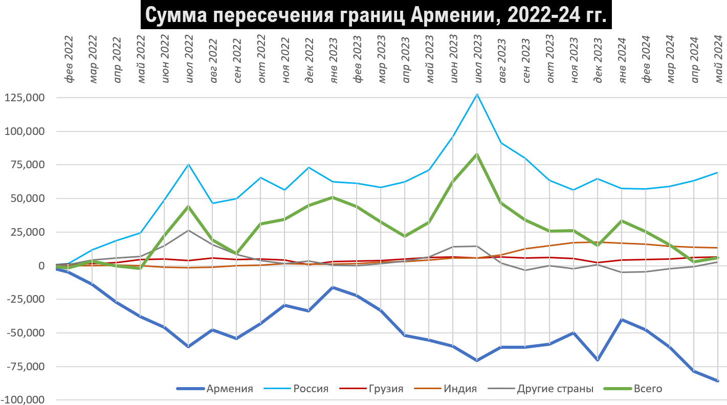 За весь рассматриваемый период (29 месяцев), миграционное сальдо Армении нулевое, хотя по гражданам Армении разность составила -80 тысяч, а по гражданам России +61.5 тысяч при определенном притоке также граждан Индии и Грузии.