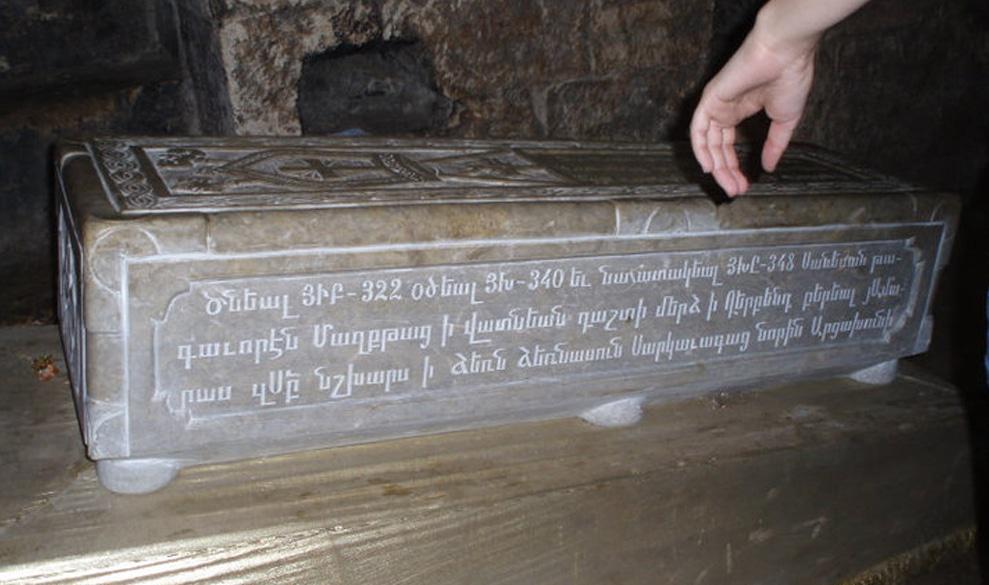 «Усыпальница святого Григориса, Католикоса Алуанка и внука святого Григора Просветителя Партева. Родился в лето 322, помазан в лето 340 и предан мученической смерти в лето 348 в Дербенте царем маскутов Санесаном, святые мощи (его) были привезены в Амарас его питомцами-дьяконами из Арцаха»