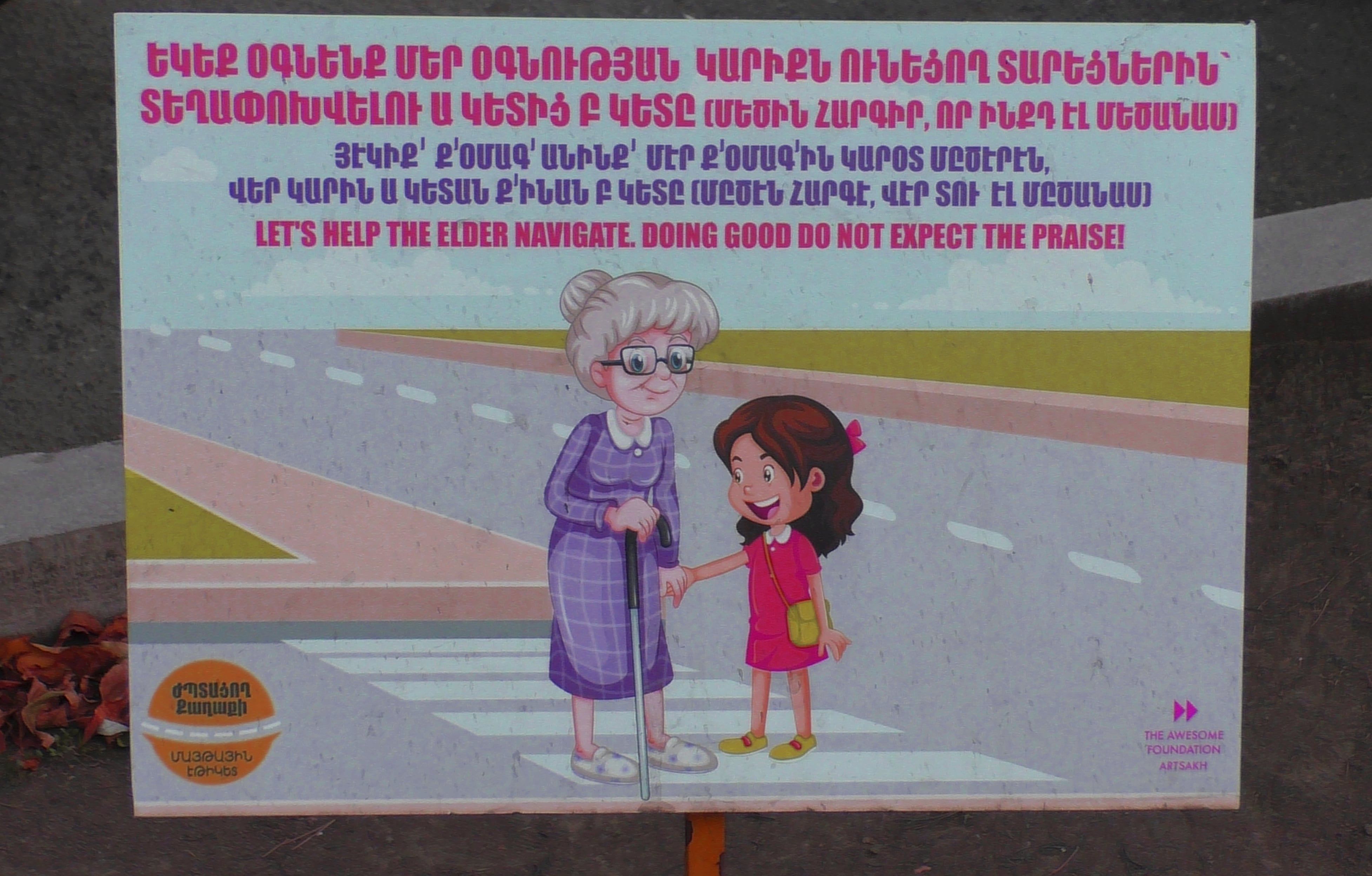 "Давайте помогать нашим старшим, тем кто нуждается в этой помощи, чтобы перейти из точки А в точку Б. (Помогая старшим, мы сами становимся мудрее)". Хороший лозунг, помогать старшим надо, один из наших блогеров провел интересный социальный эксперимент, он нанял актера, чтобы тот, на улицах Степанакерта разыграл слепого, у которого из кармана выпадают деньги. никто не позарился на эти деньги, дедушку перевели через дорогу, а деньги запихнули ему в карман.