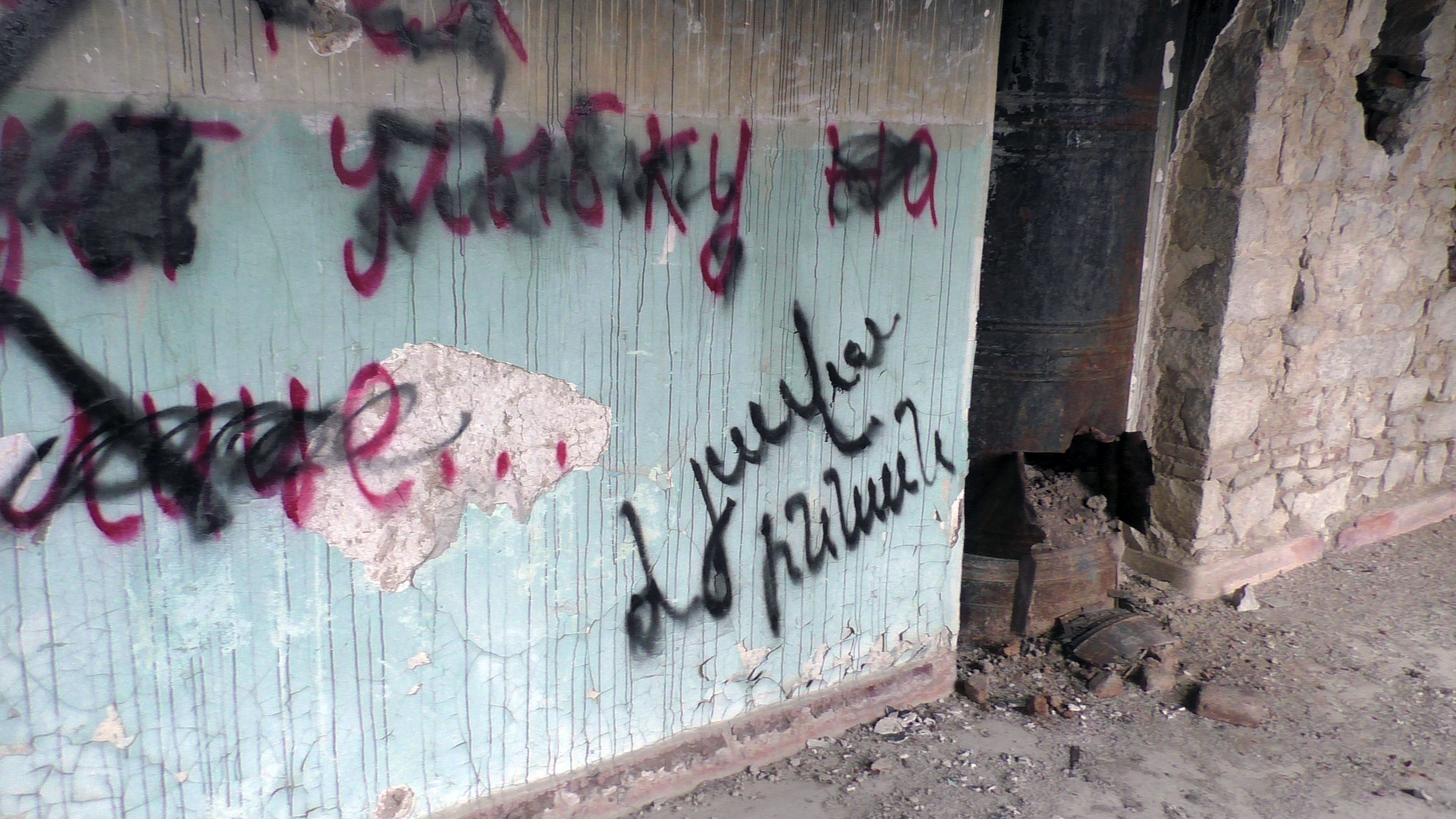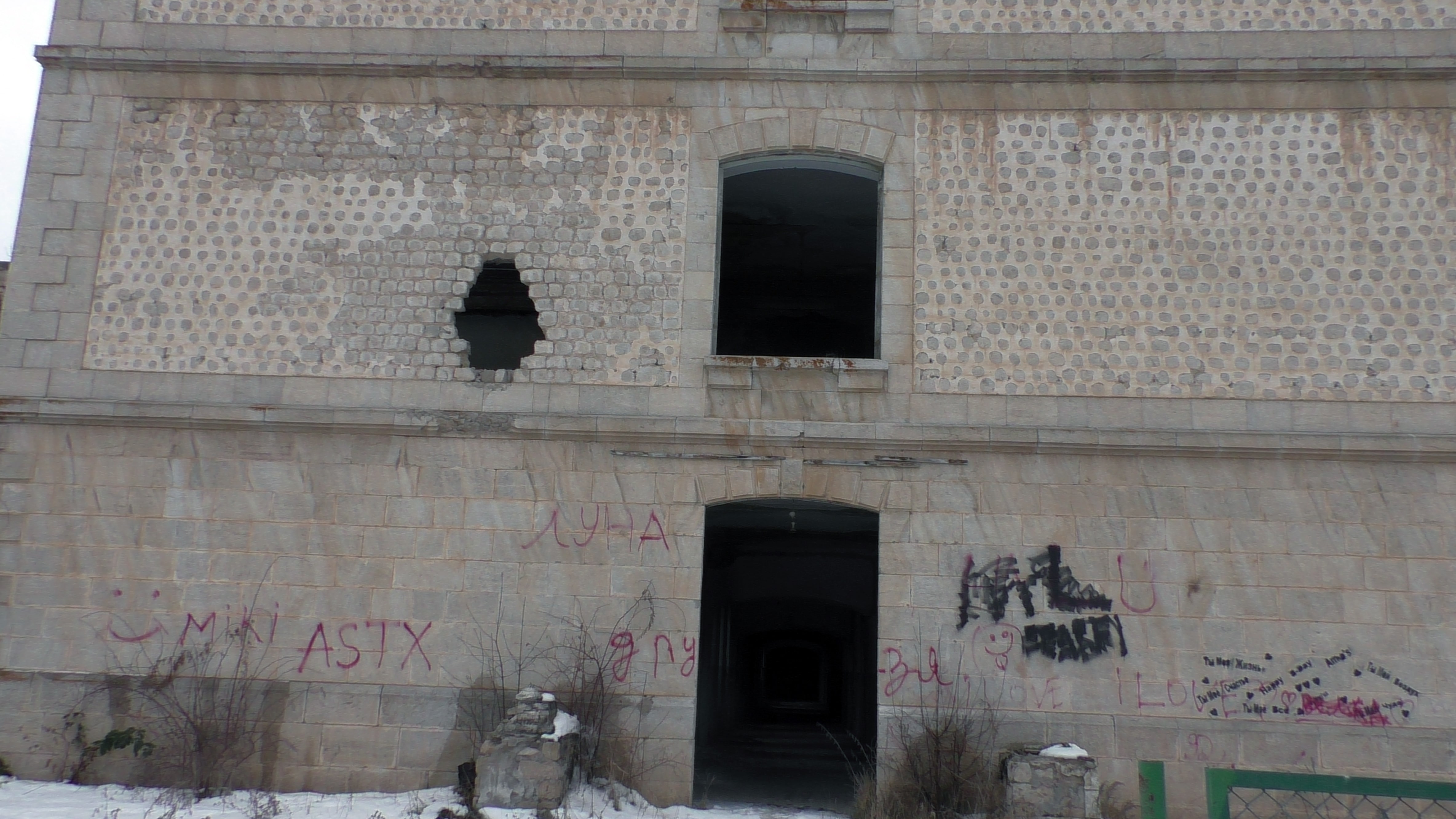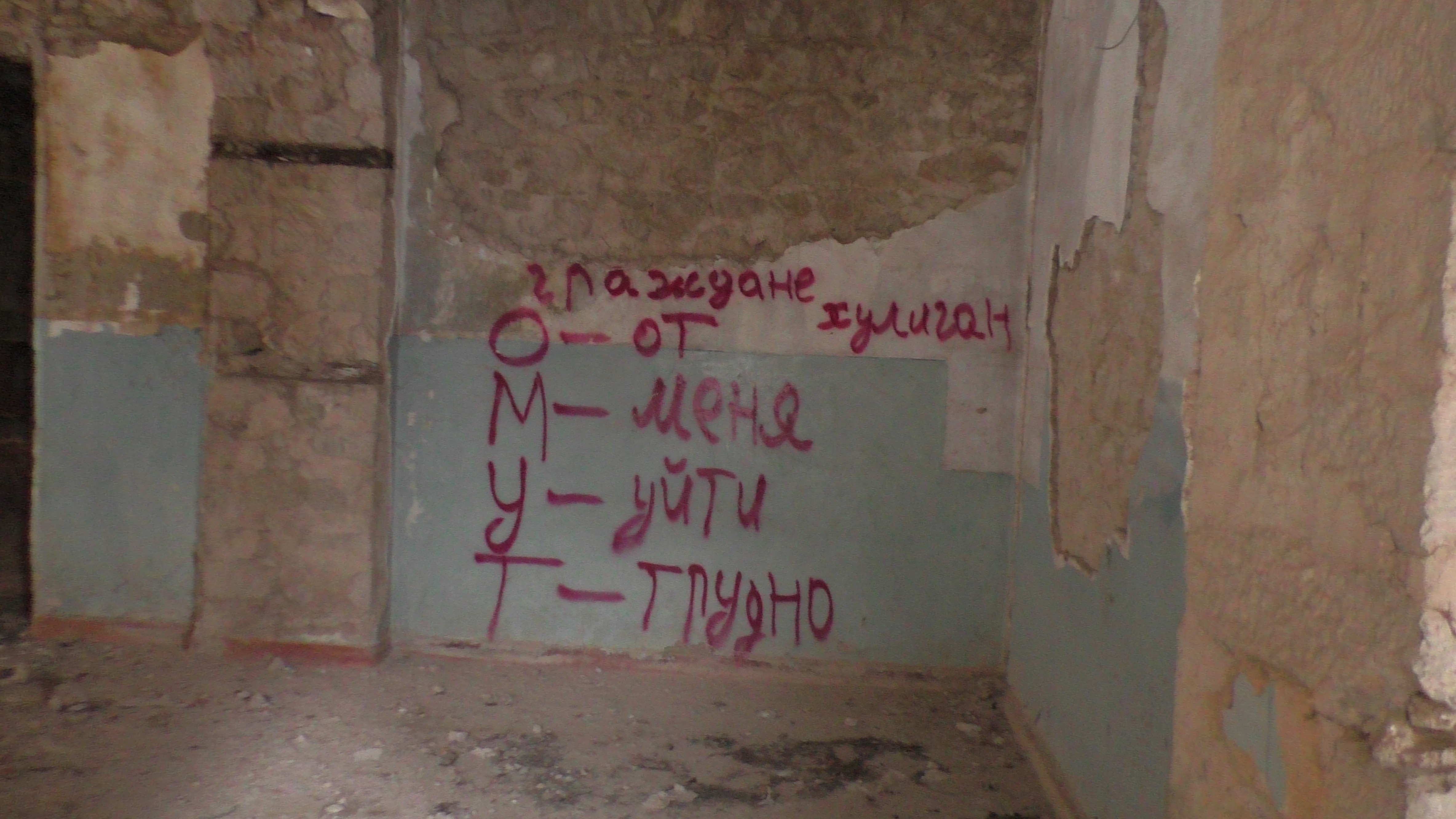 Стены в удручающем состоянии и разрисованы разными надписями