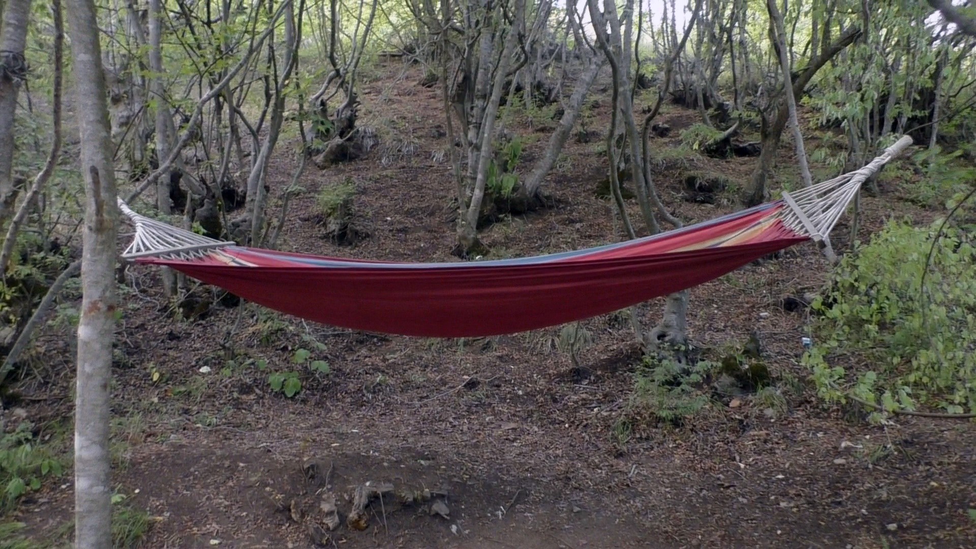 Гамак, натянутый между деревьями в укромке леса. Можно полежать, помечтать и никто тебя не потревожит