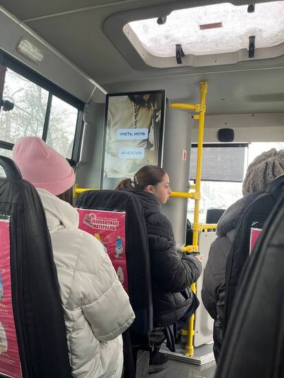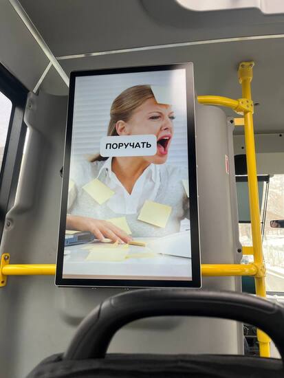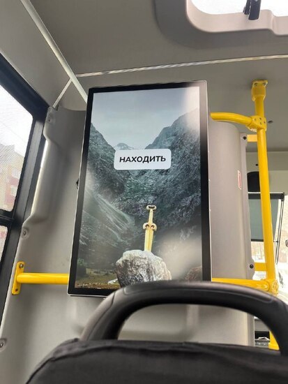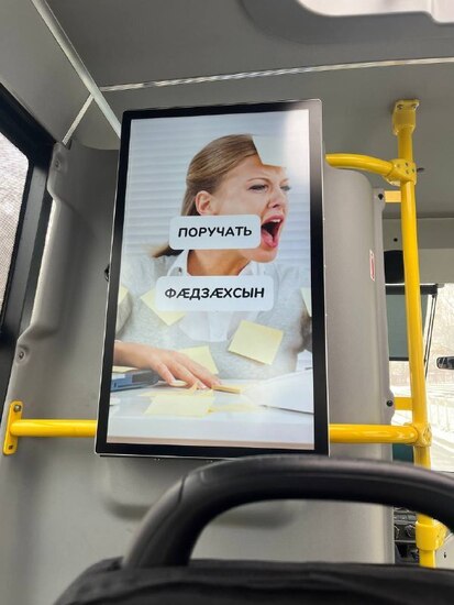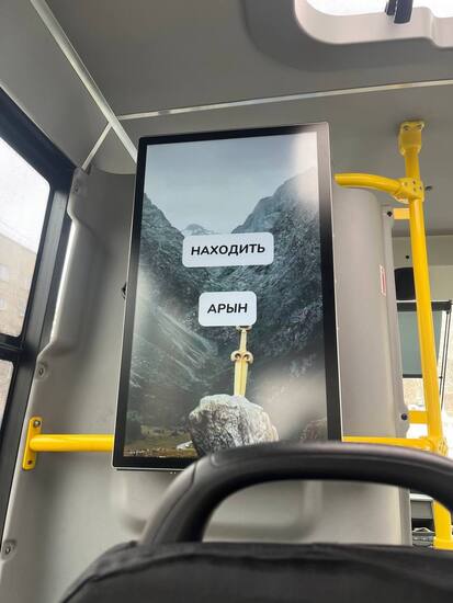 Сегодня, в День родного языка, хотела показать какие обучающие слайды появились в некоторых маршрутных автобусах во Владикавказе. Сначала на экране появляется слово на русском, даётся несколько секунд на перевод, затем можно увидеть ответ на осетинском. Такие слайды проигрываются между рекламой диванов и колбасы. По-моему, хорошая идея.