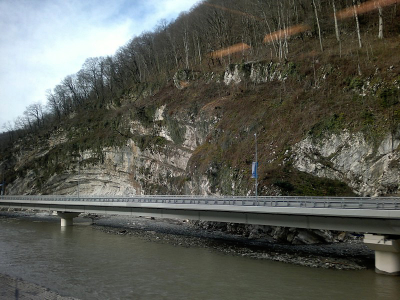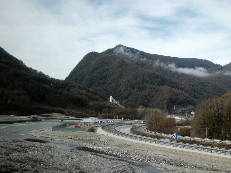 Вид из окна электропоезда «Ласточка» на участок совмещенной скоростной автомобильной и железной дороги Адлер - Красная Поляна, построенной к Олимпиаде.