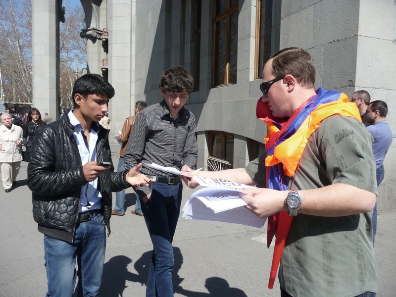 Участникам митинга были розданы листовки с надписью «DEM.AM» («Я против»).