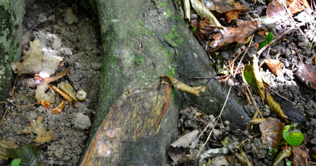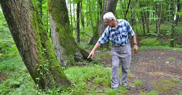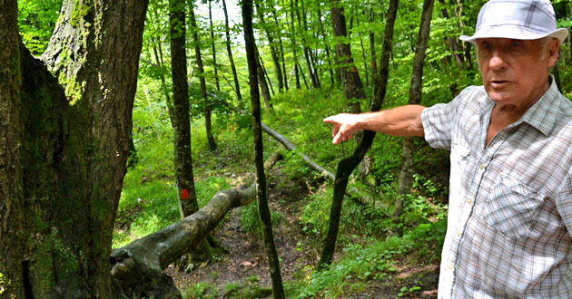 Житель поселка Шаумяновка показывает номера на корнях деревьев предназначенных к рубке