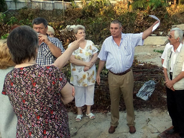 Председатель ТОСа "Завокзальный" Игорь Платонов (второй справа) показывает собравшимся разрешение на рубку здоровых 167 деревьев в парковой зоне и говорит о том, что данный документ нельзя считать законным.