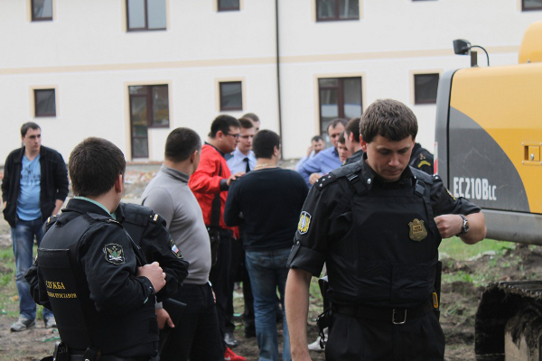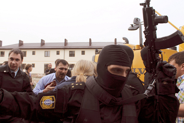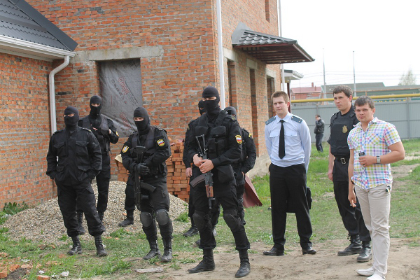 Судебные приставы с группой быстрого реагирования ФССП у сносимого дома по улице Кадетской, 9.