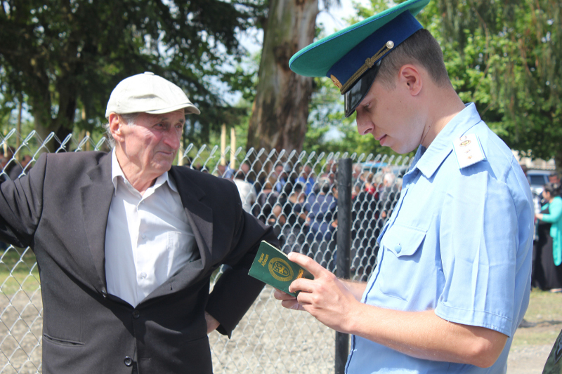 Пограничник проверяет абхазский паспорт жителя села Отобая.